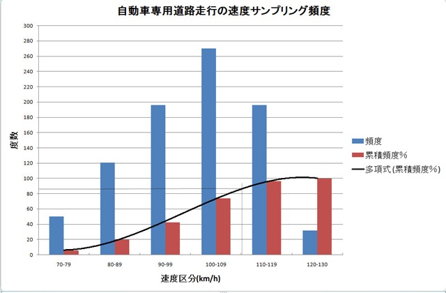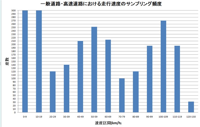 自宅から郊外の一般道路、自動車専用道路を走ったときの15秒毎の速度サンプリング記録の分析を行ってみた。生活道路や商業地は含んでいない場合である。