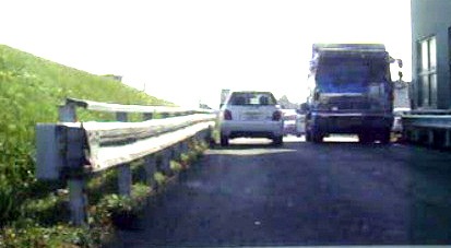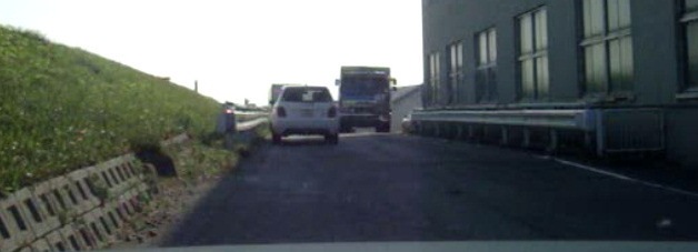 これは長良川西岸、墨俣地内の堤防道路です。制限速度は道路の状態に無関係に50km/hになっていて、何の警告もなく突然道路左側にはみ出した形で、ガードレールが設置されています。非常に危険です、特に夜間、対向車がある場合、ガードレールの切れ目は見えるでしょうか? 全く危険な構造物です。ビデオをよく見ていただくと、ガードレールの開始点に何回も接触した傷跡が見えます。また、ガードレールの上側、乗用車の助手席の顔の高さぐらいのところに四角いビームが取り付けられています。もし、路面と堤防の斜面ぎりぎりで走行したら助手席の乗員を串刺しにすることはだれが見ても明らかです。