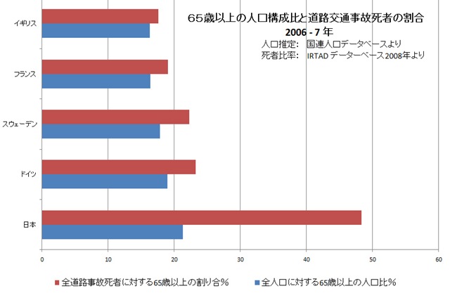 警察庁は、この表で日本の高齢者の交通事故死者は50%近くもあることを強調して高齢者の運転を止めさせる理由にしているが、このデータは道路での事故死者件数であって、高齢運転者の第一当事者のものではない。これは明らかな「うそ」に基づくキャンペーンである。なぜ欧米諸国に比べ日本がダントツに高齢者の交通死者が多いか、高齢者が、より危険な自転車や徒歩による交通に頼っている割合が多いのが一因であると思われる。アンケート調査による不正確なデータであるが、高齢者の交通手段としての自動車の利用は、日本33%に対しフランスは40%である。交通事故死者だけの統計を見ると、高齢者は同規模の事故に対し死亡率が3~4倍高いことも統計的に証明されている。