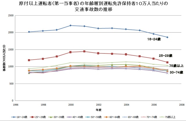 上のグラフは、第一当事者の10万人当たりに換算した事故件数の年次推移であるが、これを見てわかるように、75歳以上でも(黄緑)30歳以上の運転層よりわずか多い程度である、30歳以下の若年層より(青、赤)より格段に少ない。