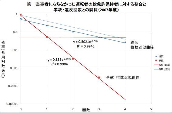 グラフからおおざっぱに見えてくることは、運転者の安全度評価は、事故回数歴1回に対し、違反回数歴3~4回が同確率であることが分かる(細線の交点または冪指数の比-2.7/-0.75=3.6)。