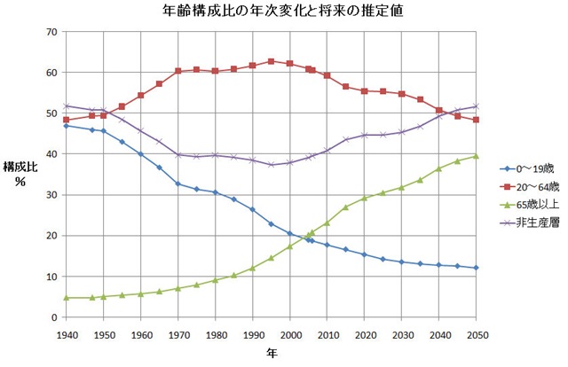 非生産人口も、消費という形でGDP成長の需要を喚起することは確かであろうが、1950年代初期までは、非生産年齢層(子供)の人口が生産人口を上回っていた。以後、減少期にはいり1970年に1.5倍となり,生産人口の割合が増加し現在と同レベルに達した。1970年までの高度成長期には、当時、消費にそれほど関与しない教育期の年少者人口を抱えながらGDPの成長を実現した世代である。これを見ると、高齢化によって社会消費が減るとのことでGDPが減るという結論は疑問である。