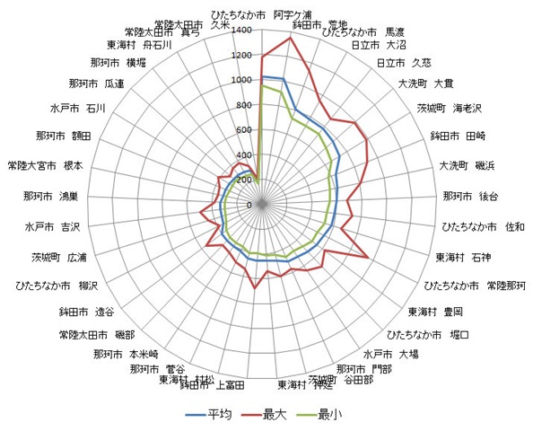 茨城県の原子力周辺環境モニタリングデータ全部について3月22日16時より24時間の期間、毎正時の観測値を各観測局毎に、平均値、最大値、最小値を求めレーダーグラフにしたものである。単位はnGy/h でこの値の1000分の一がマイクロシーベルト/hに相当する。
