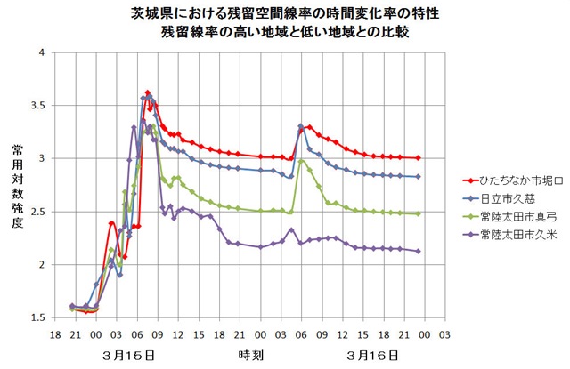 このグラフは、縦軸を対数軸に取っているので。縦軸の目盛間隔は強度比に対応する。常用対数を取っているので一目盛が10倍に相当する。すなわち、残留線率の高いひたちなかの市堀口ではピーク直後、約1/3に減衰したのに対し、残留の少ない太田市久米では1/10以下に減少している。