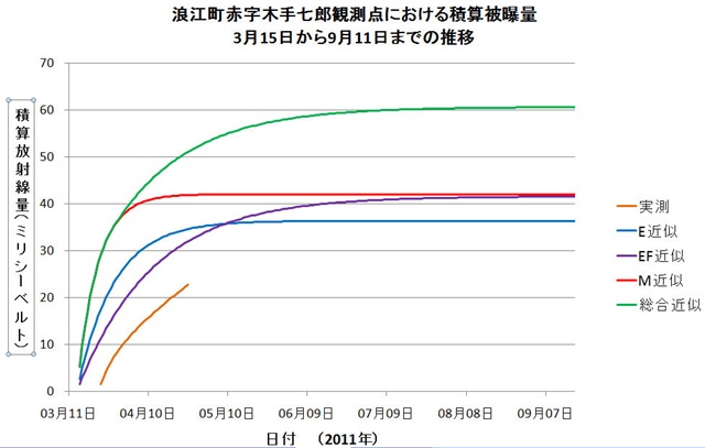 上のグラフは、部分近似よる線量と総被ばく線量の様子で、3月15日放射性核種が爆発放出された当初からの推定値を含めて積算した結果である(緑色曲線)。