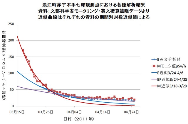 上のグラフは、空間線量率データで、Eは英文被曝線量データベース、Mはモニタリングカーデータベースのもののプロットである。3本の近似曲線は、それぞれのデータベースに対して求めた指数関数近似曲線で、日付範囲は求めた対数減衰係数の区間である。