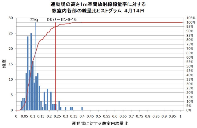 文部科学省の最初の測定値4月14日と今回公表された6月2日の線量測定値について、各学校の校庭の高度1mを基準とした教室内線量率比のヒストグラムを示したものが下のグラフである。日次の経過とともに教室内の線量強度の分散が高汚染比の方に進んできていることが分かる。赤線は累積度数分布の%値である。(グラフをクリックすると拡大できます)