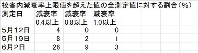 6月2日には、屋内減少比0.4以上の測定値が25%強になり、0.8でも10%に近付いている。窓を開けざるを得ないこれからの季節、例え早朝や、放課後に窓を開放し冷却するとしてもこのような状況を見ると、室内軽減は見込めない。
