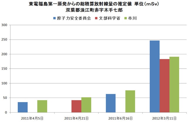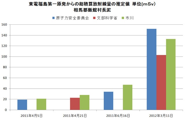 何れの推定値も科学的には大差ないと云えるが、年間推定値に於ける違いは、放射線量が定常化したと見た時点の違いが原因している。原子力安全委員会の計算値はまだ放射線量の減少期である4月6日の放射線量が一年間続くと仮定したものであり、文科省は4月22日、市川は6月16日の放射線量を用いて計算したものである。