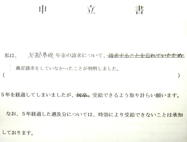 せめてもの抵抗として、あらかじめ印刷されていたていた理由を横二重線で消し、本当の理由「裁定請求をしていなかったことが判明しました」を記入し、理由のわからない語句”何卒”を消して提出しました。