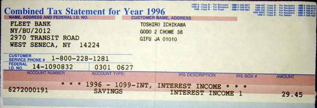私の口座がニューヨーク州に移管されたのは、毎年上のような預金利息の納税対象金額の報告が銀行から来ていたが、少額であり、アメリカでの他の収入が無いため納税申告をし無かったためと思っています。最後に預金を出し入れをしたのが1990年、記録によると州に移管されたのが1997年となっていました。