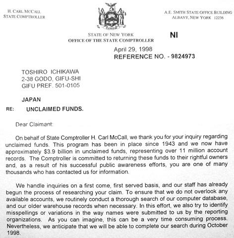 先日書いたニューヨーク州に凍結されていた銀行預金の返還要求をした時の、州役所からの最初の手紙の一部をコピーしました。