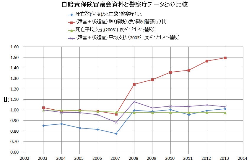 傷害・後遺症害については2008年以降警察庁の負傷者数と比べると2007年までは一致していたが2008年突然25%上昇以後一定のとトレンドで上昇し2012年末には50%に達している。高齢者増加の影響であれば、当然警察庁のデータにも表れるはずである。これが補償総額の増加の原因であるがこのことに関しての質疑も審議もされていない。