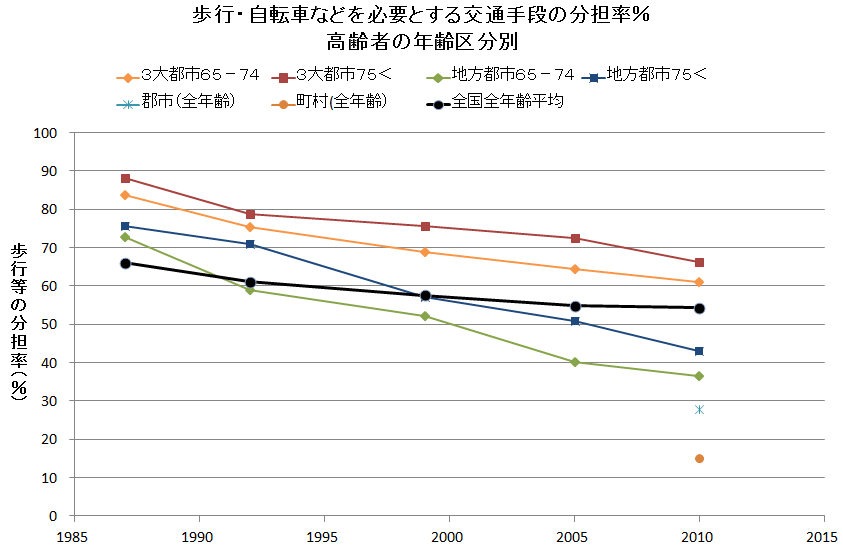このグラフは上記の国土交通省データベースから、外出単位ごとの歩行等の実行分担率を描いたもので、全国の平均の歩行等の分担率は55%程度(2010年度)である。いずれの区分でも大都会ほど歩行割合が多いことがわかる。
