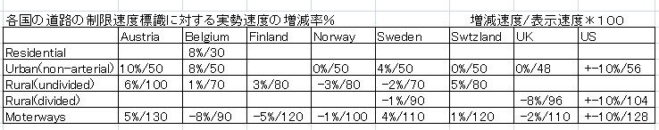 住宅地のデータを発表しているのはベルギーだけであるが30km/hに対し超過速度が8%、市街地では、各国とも50km/h制限に対し最高10%(5km/h)超過、郊外一般道路では、70~80km/hに対しー3~+5%(4km/h以下)、自動車道では100km/h~130km/hに対し-5%~+4%(5km/h以下)となっていて、非常に速度標識と実勢速度との乖離は少ない。