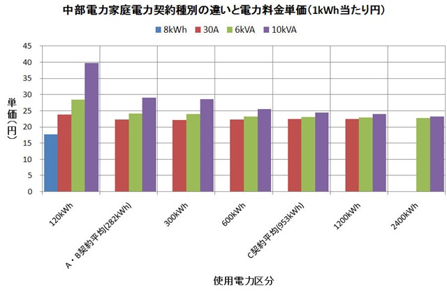 これは基本料金のためであるが、中部電力サービスエリアの平均電力使用量約300kWhの40%程度しか使っていない120kWh以下の劣悪な電力使用で我慢している家庭の方が電力量単価で見ると高額になっている。