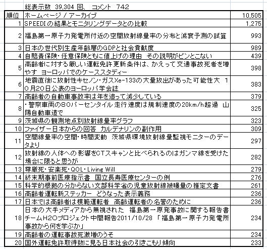 上位20タイトル記事の中で、福島原発関連の開示総数は 4,048 回、高齢者運転に関するもの 1,289、世代別GDP 989、尊厳死関係 848、私としては、重要で社会的に重い問題と思って書いた記事の参照が上位に位置していることをありがたく思うとともに安心しました。