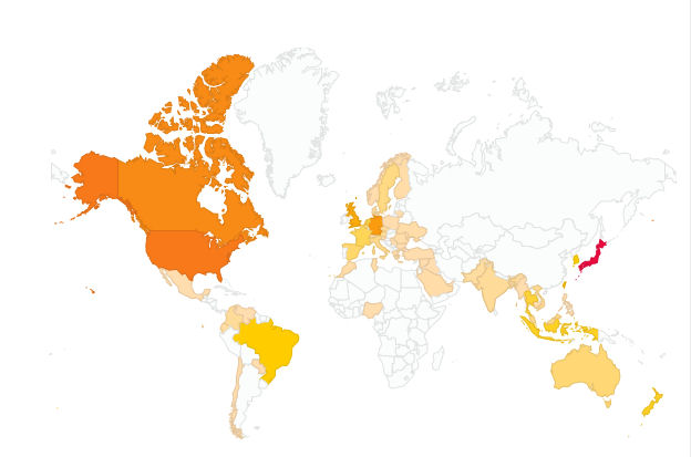 私のブログの国毎の閲覧地図(2012年12月より集計)。 すべて日本語の記事であるから海外在住の日本の方の閲覧と見られる。