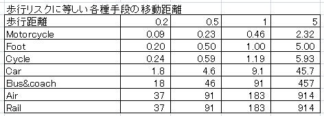 この表から歩行(km)のリスクと等しい各交通手段での移動可能な距離を試算してみたのが下表である。