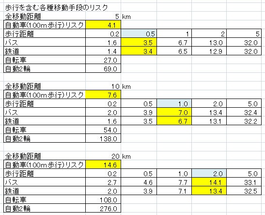 目的を達成するまでの総移動距離、5km, 10km, 20km に対し、公共交通機関を利用した場合、乗車前後の歩行または自転車利用の距離が200m, 500m,1km, 2km, 5km であった場合についてそれぞれのリスクを表にしてみた。