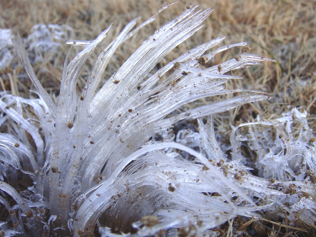 岐阜市南西部、今冬はまだ雪がなく好天の日が多い稀な気候である。今朝は放射冷却で氷点下5℃程度であったろうか、庭の芝生に生えた霜柱。