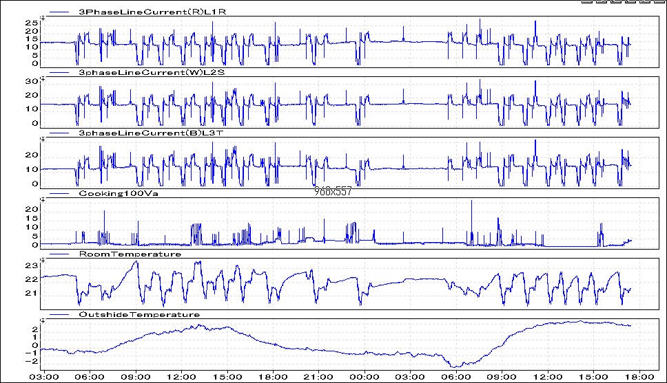 下のグラフは昨日から今日にかけての我が家の空冷ヒートポンプ式のエアコンの運転記録である。上段の三つのグラフは三相電力の各相の電流値(A)、