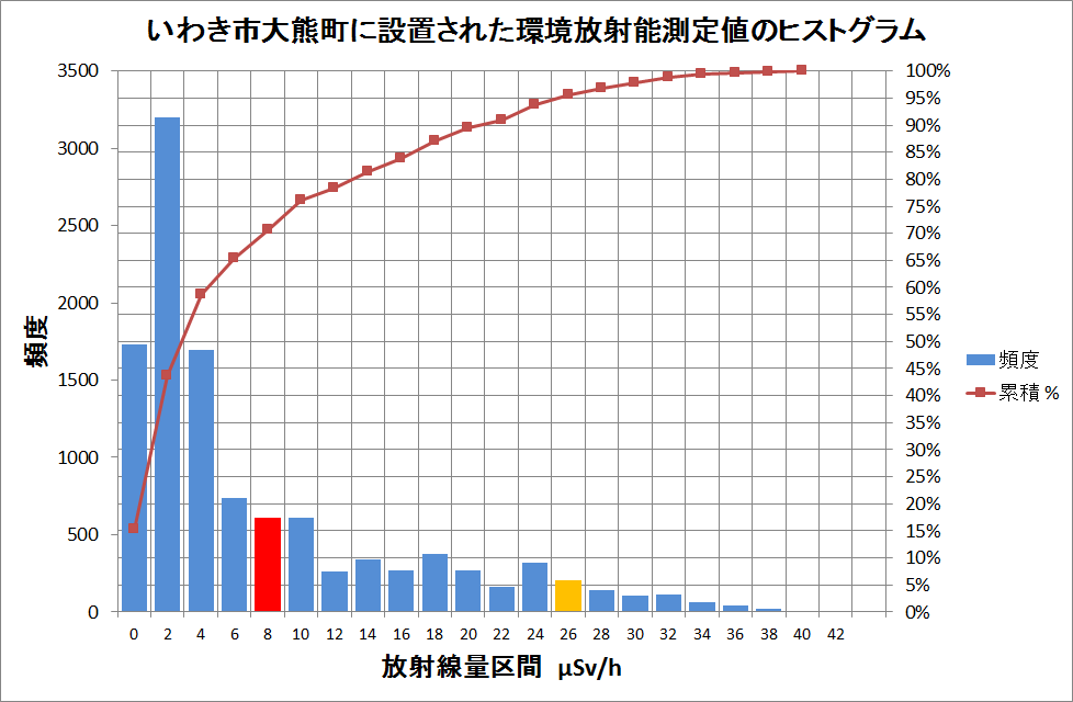 赤で塗りつぶした棒は平均値を含む区間の頻度、オレンジ色は積算頻度分布が95%になる区間上限値である。平均値より放射能強度の地点が30%もある。