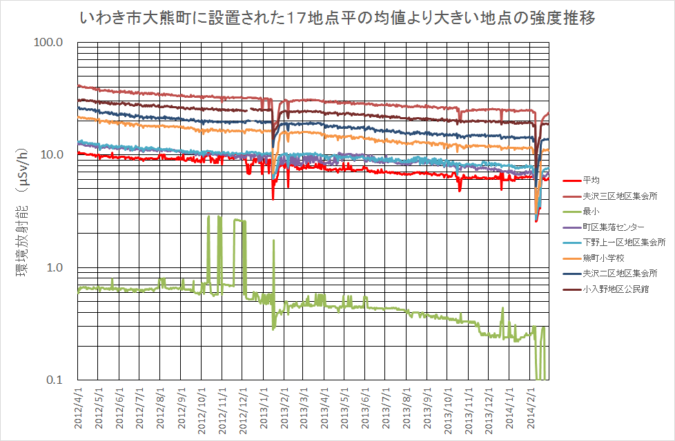 上のグラフは大熊町各地で観測された強度推移のうち、平均値より高い地点の推移グラフであり、縦軸を対数圧縮したものである。