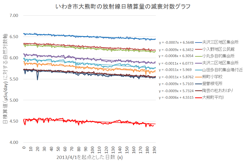 下のグラフは、各地点での放射能観測値が安定した期間である、2013年4月1日を起点として190日間、一日当たりの累積線量(μSv/day)の値を自然対数であらわした日推移である。