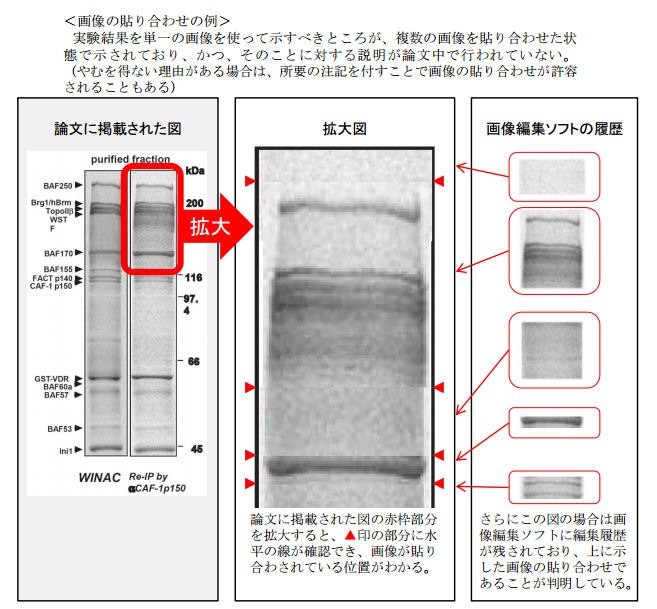 この画像では、3列目の映像が他の実験画像から取られたもので、倍率を合わせて一枚の画像のように見せたもので、証拠写真のように扱われていると指摘されたものである。この加工がが論文中で説明されているか、画像に囲み線が挿入されていればこの行為自体は非常識ではない場合があるとの指摘は研究者の意見として上がっている。
