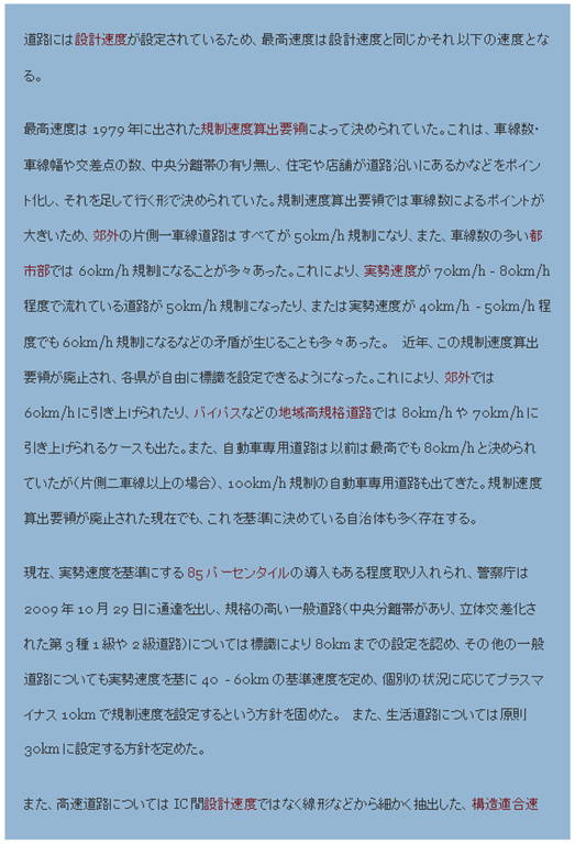 規制速度の決まり方。 ウィキペディア 2014/9/4 の記事