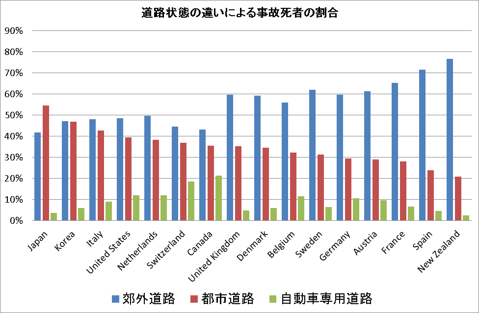 下のグラフは道路状態の違いによる交通事故死者の割合を示すもので、日本だけが都市での死亡割合が郊外道路より多い特徴的な状態であることが見られる。