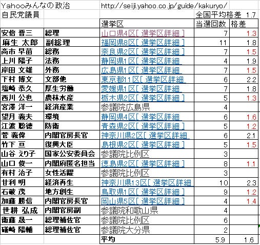 安倍内閣の主な閣僚について、選挙区、当選回数と選挙区の票の格差を表にしてみた。格差の値は選挙区の有権者数が少ないほど1に近づく、全選挙区の平均は1.7、下の表では、これより小さい格差を赤字で示した。これをどう見るか、格差が平均より小さい選挙区からの閣僚が10名、大きい人が6名。実際には、選挙区内の立候補者数、投票率に依存するのでこれが得票率を表すものではない。何となく、人口移動が少なく小さい選挙区の出身者が連続当選しやすく、有力議員になりやすいようにも見える。実質的な出生や生活の本拠ではなく選挙期間だけの里帰り立候補も不自然に見える。