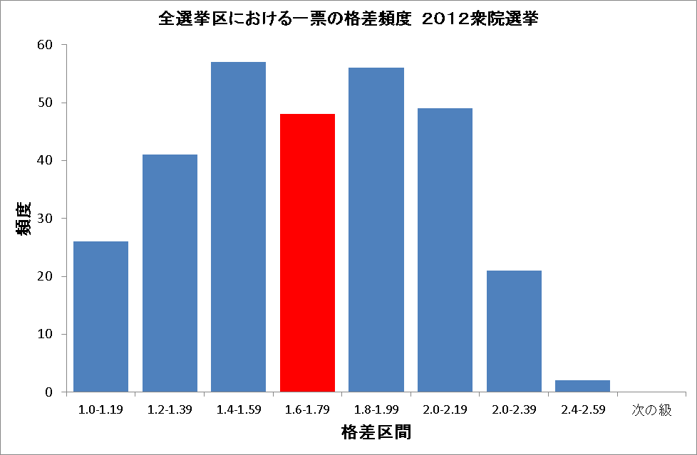 問題になっている票の格差はどんな状況か、全選挙区について格差の値の度数分布グラフを描いてみた。平均値を含む区間を赤色で示した。数値だけ見れば、新聞などで云われているほど不合理であるとは言えないが。人口移動によるのか平均的な選挙区が減り、二極化しているようにも見える。