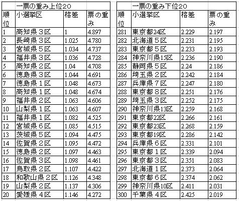 正確にはこれらの選挙区の人口や税収の変化を見なければわからないが、票の重み上位の地域は、人口の流失、高齢化による死亡など人口の減少の結果起こった現象と見られ、これと反対に人口流入の激しい地域が下位になっているように見える。