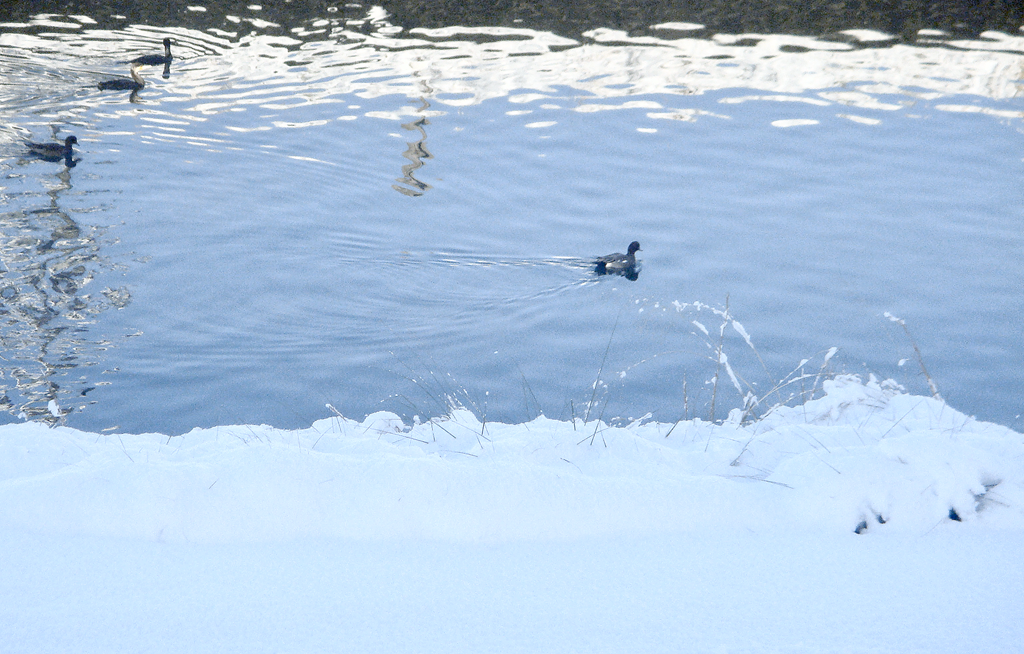 自宅の窓から見た風景。冬にはシベリアからやってくる鴨が休む小さな都市河川ですが今朝は大型の水鳥も飛来していました。