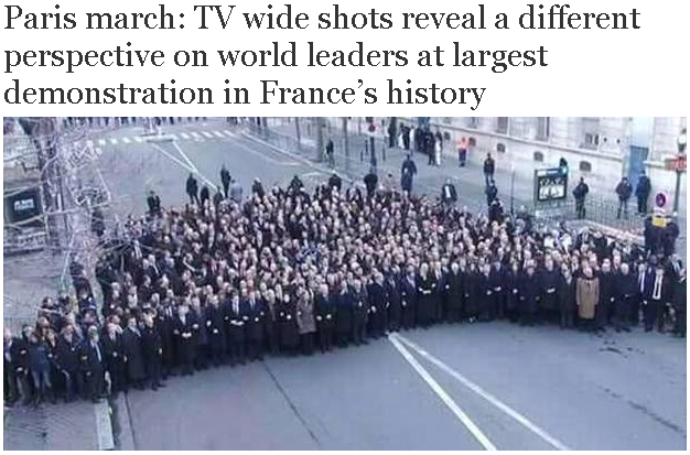 でも、この勇ましいデモ行進の俯瞰映像は以下のようだったとの報道。しかも、この要人の中の何割が私服警備関係者だったろうか、またこの映像の視野の中に入れないで排除された人々がどれだけいたのだろうか? 憶測が膨らむ。警備を無視した無鉄砲な行動が更なるテロを呼び、取り返しのつかない混乱を招くことはわかってはいるが、参加した要人それぞれの意図が知りたい。