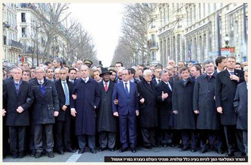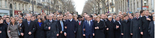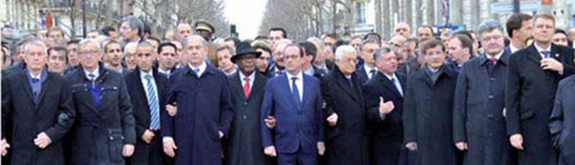 下の映像からは、命の危険を冒してまで大衆の先頭に立つヨーロッパの指導者たち、テロに屈しない力強い決意のデモ行進と見える。