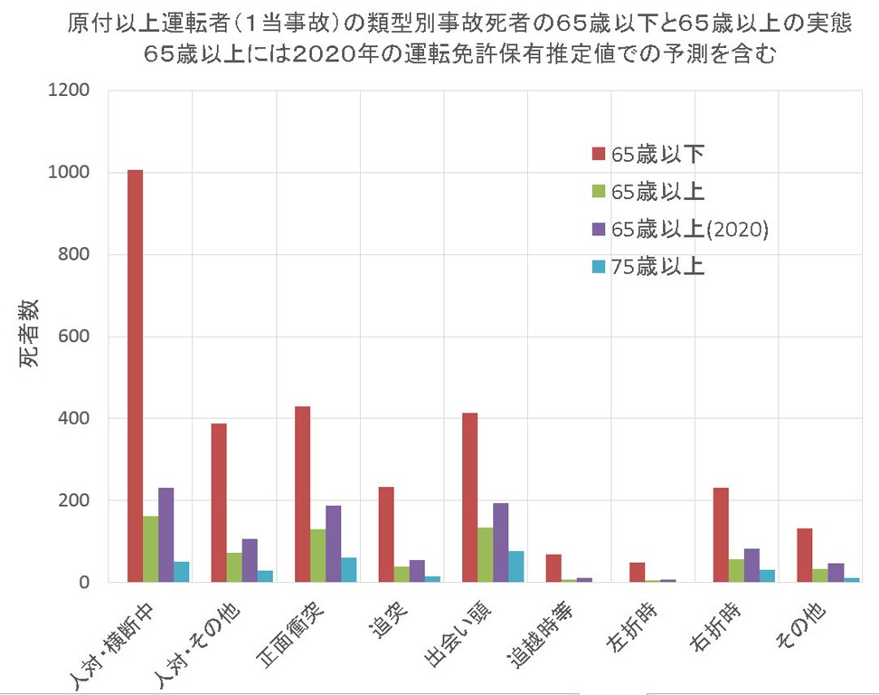 これを見て明らかなことは実勢の交通(2013年)において高齢運転者は社会に危機を与えるようなことは、現在も、2020年でもないということである。特に歩行者との死亡事故は大部分が65歳以下の運転者で起こされており、高齢運転者は2020でも20%程度である。