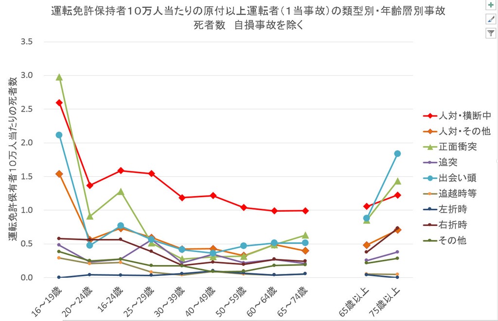 このグラフで、特に際立った特徴は、高齢運転者は歩行者を死亡させる事故が非常に少ないことである。この事実はイギリスでも確かめられている。しかし、このグラフは事故の類型別構成率であり事故の実態の全容を表しているものではない、たとえば若者と高齢者は追突と出会頭の事故構成率が高いために相対的に横断中が少ないように見えることに気が付くべきである。