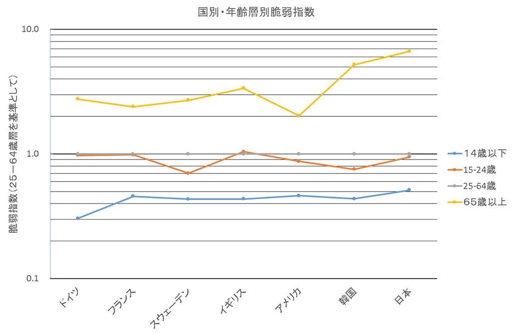 年齢層別脆弱指数の国際比較 日本の高齢者は飛びぬけて大きい 歩行・自転車の利用者が多いためであろうか?