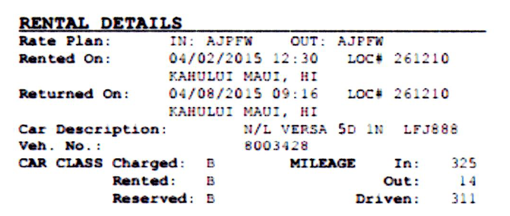 借りた時の走行マイル14(22キロメートル)、返した時のマイル数325、走行距離311マイル(498キロメートル)。