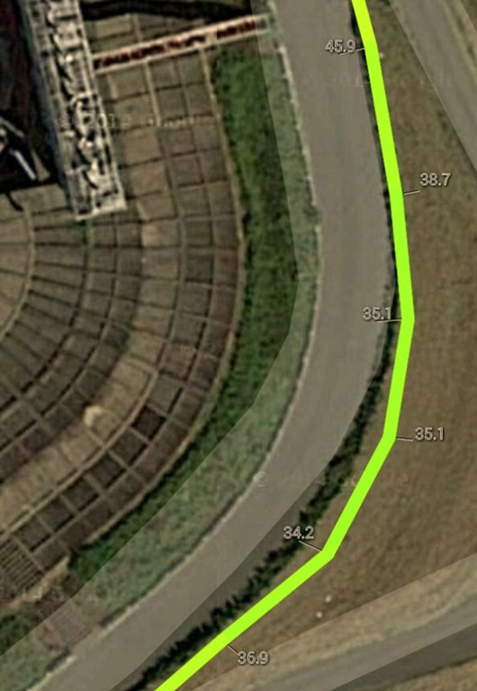 上の画像は左の速度でこのカーブを通過中の車にかかる遠心加速度である。