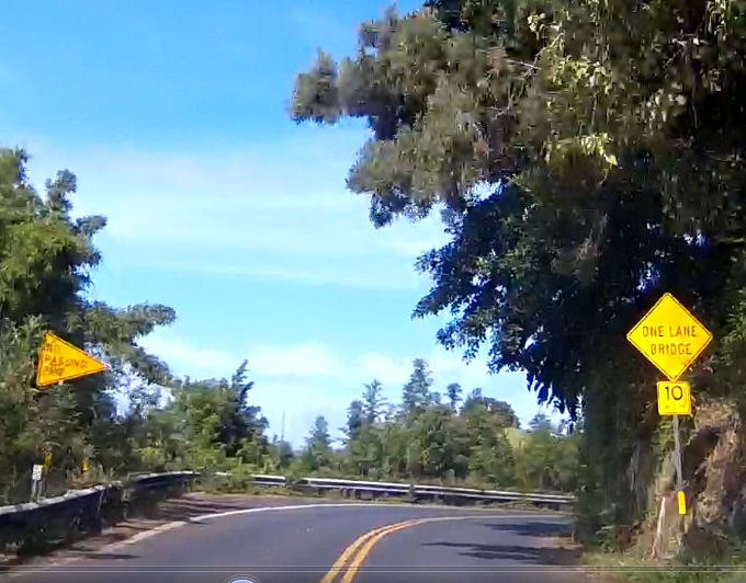 下の画像は、すぐ先に双方向交互通過の橋があるので速度を10MPH(時速16キロメートル)に減速せよとの予告標識である。左側には追越し禁止の分離帯がなくなる狭い双方向道路になり対向車と出会う可能性のあることを示している。