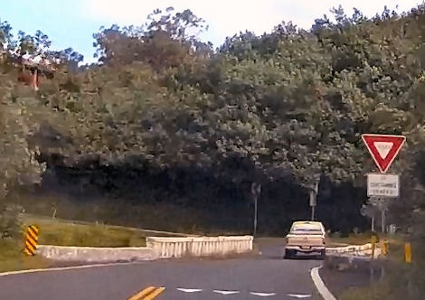 先にある狭い橋では、対向側に優先権があり「譲れ」の標識と路面の停止線。夜間初めての道路でも標識の情報で安心して走れる。