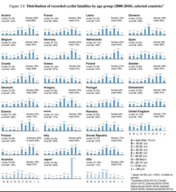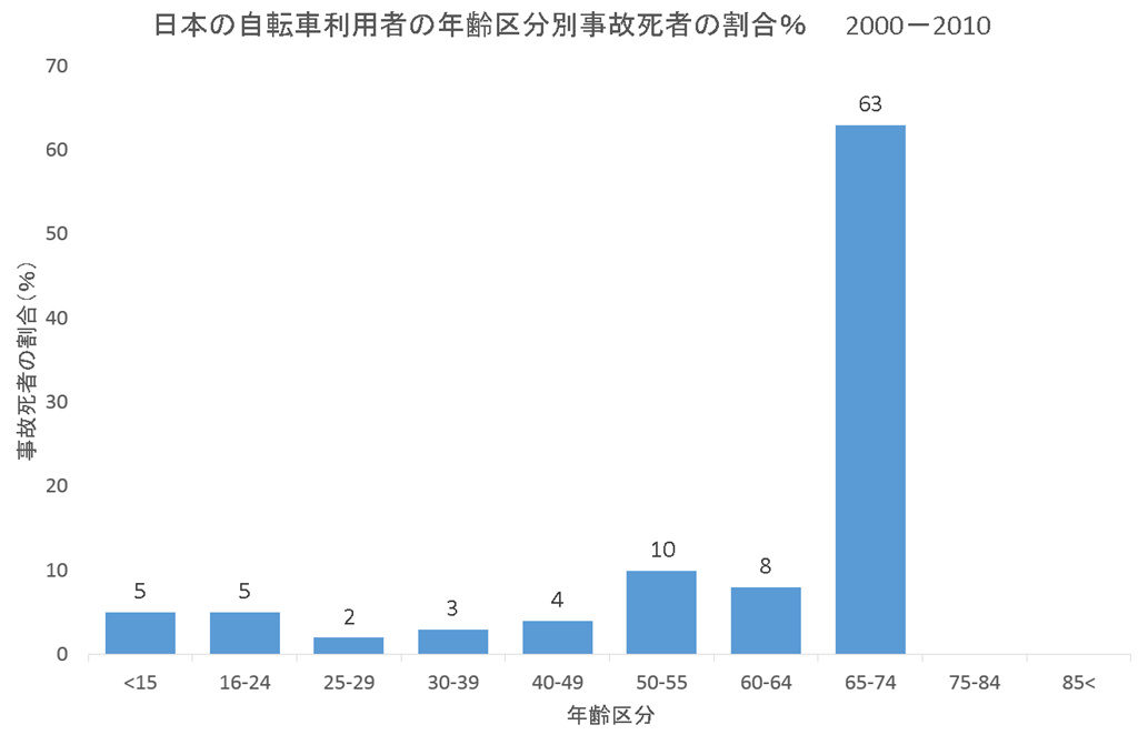 この報告書は249ページに及ぶ多角的分析のもので、まだ全文を読んでいないが。自転車事故死者の統計で日本だけが異常に高齢者の死者が多いことが報告されている。p.112