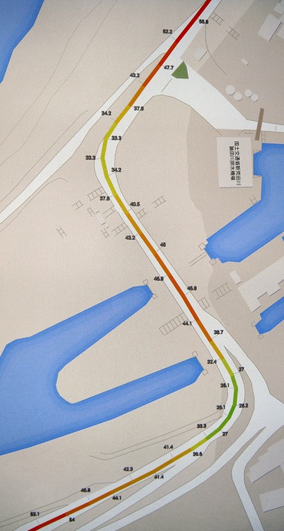 走行経路の俯瞰図を下に示す。走行は画面下か上に向かって通り抜ける場合で、数字は速さ、上記のグラフに対応する。