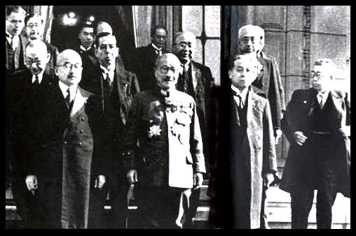 内閣総理大臣東條英機(最前列中央)ら東條内閣の閣僚と岸(前から2列目左から2人目)