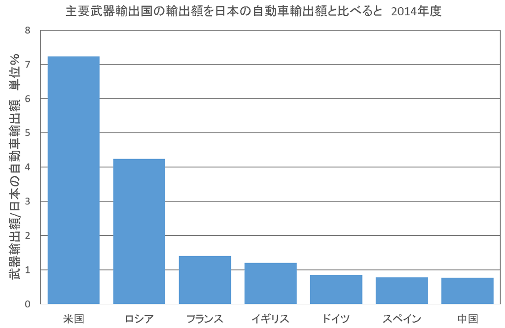 2014年度の日本の自動車輸出額と比べてみた。将来、もしドイツと同じ規模の武器輸出額を得たとしても自動車の1%以下。自動車産業はいかに大切かが分かる。