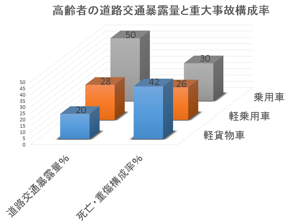 上記の普通乗用車と軽乗用車の比率は、主に車での移動を生活のために使っている熟年高齢者の実情に近いと見られ、これらの人々の半数以上が利用していると推定される軽乗用車は、普通乗用車より1.6倍死亡・重傷の危険が大きいと判断される。